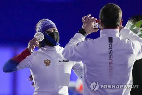 Russia's Angelina Golikova shows her silver medal after the medal ceremony of the women's 500 meters race of the European Speedskating Championships single distances at the Thialf ice arena in Heerenveen, northern Netherlands, Saturday, Jan. 8, 2022. (AP Photo/Peter Dejong)