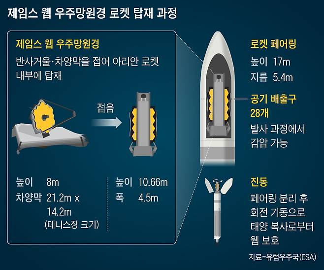 제임스 웹 우주망원경의 핵심은 금빛 반사 거울 18개로 이뤄진 주반사거울이다. 금을 코팅한 베릴륨으로 만든 육각형 모양의 반사거울을 연결해 벌집 형태로 만들었다. 주반사거울은 양쪽 가장자리의 거울을 3개씩 날개처럼 접은 채 로켓에 실렸다.