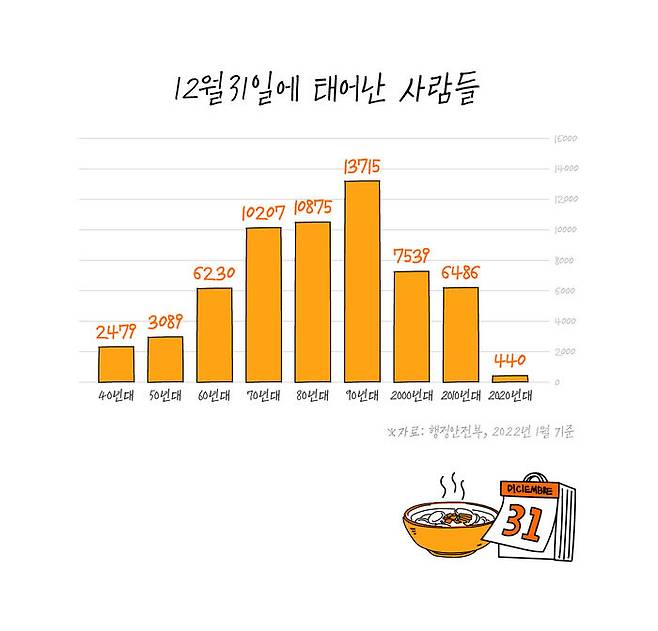 1930년대 이상 12월 31일 출생자 1757명을 제외하고, 연도별 추세를 보면 억울한 분들은 90년대에 태어난 분들이 가장 많습니다. 1940년대 2천479명, 1960년대 6천230명을 거쳐, 1980년대 1만 875명으로 점차 늘어나던 '세밑 출생자'들은 1990년대에 1만 3715명으로 최다 인원을 기록한 뒤 다음 세대 2000년대엔 7천539명으로 급격히 줄어듭니다.