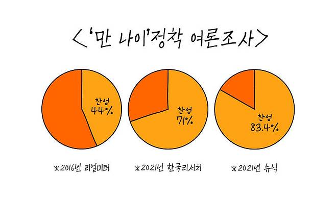 만 나이 정착을 둘러싼 여론조사에선 시간이 지날수록 찬성 여론에 무게가 쏠리고 있습니다. 지난 2016년 여론조사기관 리얼미터가 전국 19세 이상 529명을 대상으로 설문조사를 실시했을 때에는 '한국식 나이 유지'가 46.8%, '만 나이로 통일'이 44%로 오차 범위 내 접전으로 나타났습니다. 당시 지역별로는 대구 경북에서 '한국식 나이 유지'가 54.3%로 가장 높게 나타났고 수도권에서도 한국식 나이를 유지해야 한다는 견해가 49.5%로 더 높았습니다.