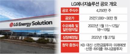 LG에너지솔루션은 이번 상장에서 4,250만 주를 공모하며 공모가 희망 밴드는 25만 7,000∼30만 원이다. 공모가 상단을 기준으로 산출한 공모 예정 금액은 12조 7,000억 원, 예상 시가총액은 70조 원이다. 상장과 동시에 유가증권시장 시총 3위 내 진입이 예상된다.