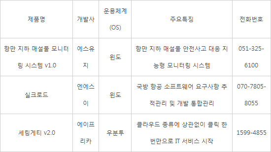 접수된 제품은 1차 서류심사, 2차 데모(발표)심사, 3차 GS인증(1등급) 심사 과정을 거친다. 수상 추천작으로 에스유지 '항만 지하 매설물 모니터링 시스템 v1.0', 엔에스이 '실크로드', 에이프리카 '세링게티 v2.0'이 출품됐다.