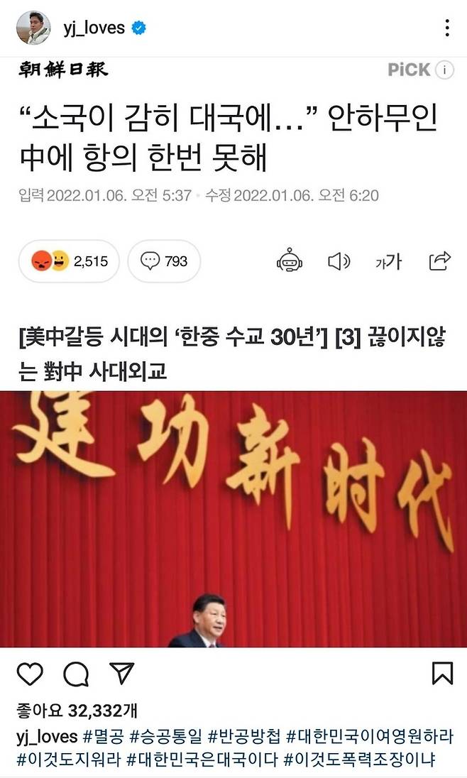 또 포털사이트 네이버에 '반공방첩'을 검색하면 음식점이 뜨는 사진을 올렸고, 작년에 두 차례 통신 조회를 당했다는 '통신자료 제공내역서 확인서'를 캡처해 게시했다. 이어 북한의 탄도미사일 발사 관련 기사와 김정은의 사진을 게시하며 "내 멸공은 중국보다는 우리 위에 사는 애들을 향한 멸공이다", "나의 멸공은 중국과는 아무런 상관이 없다" 등의 글을 첨부했다.
