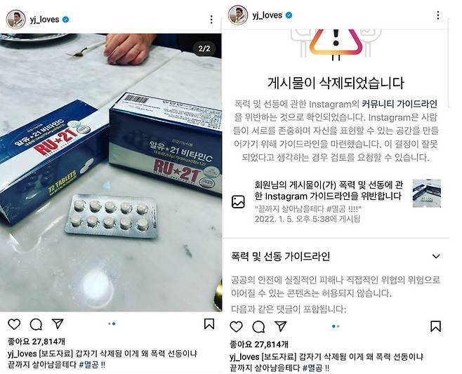 지난 6일 인스타그램은 정용진 신세계그룹 부회장이 숙취해소제 사진과 함께 '끝까지 살아남을 테다. 멸공'이라는 해시태그를 단 게시물을 삭제했다가, 하루 만에 복구했다.
