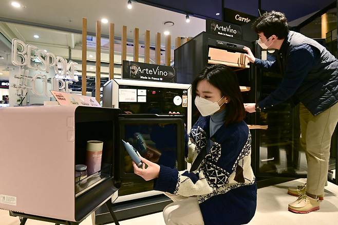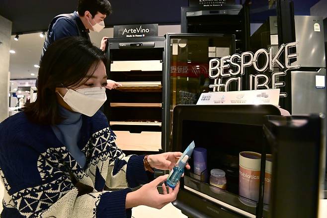 주말 서울 용산구 전자랜드에서 고객이 와인 냉장고와 비스포크 큐브 냉장고 등을 살펴보고 있다.