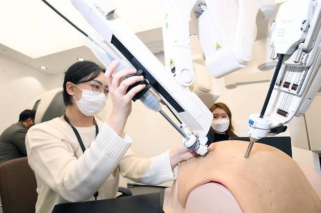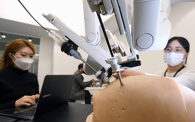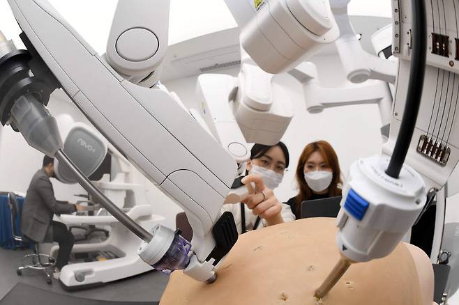 미래산업 기술 발전과 함께 고령화로 헬스케어 시장이 커지면서 업계가 첨단기술이 도입된 수술로봇 연구 및 개발에 박차를 가하고 있다. 주말 서울 송파구 미래컴퍼니에서 연구원이 종합병원, 공공의료기관 등 다양한 의료 현장에서 사용될 복강경 수술로봇 레보아이(Revo-i)의 원격중심 테스트를 하고 있다.