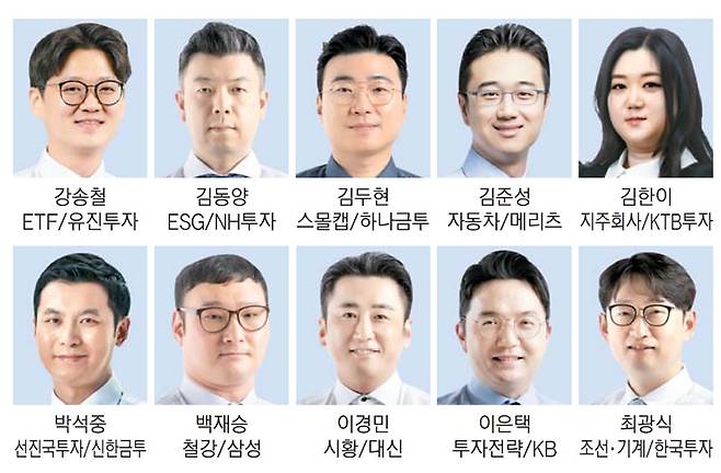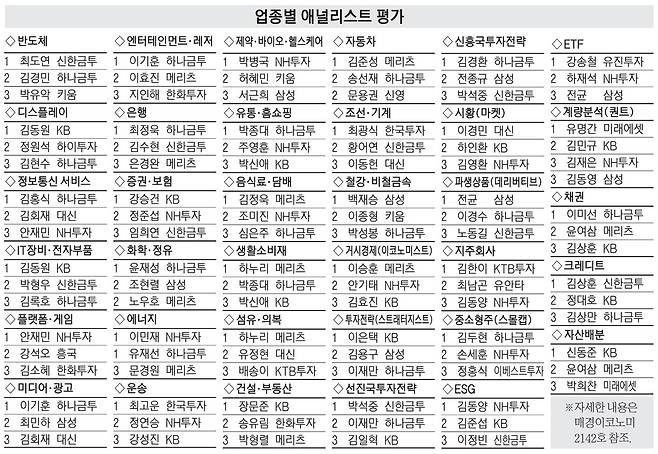 3위 KB증권은 이번 평가에서 2계단 올라섰다. 베테랑 김동원 애널리스트가 디스플레이와 IT장비·전자부품 부문 1위로 2관왕을 기록했다. 자산배분 전문가 신동준 센터장은 이번에도 1위를 지켰다. 그는 올해부터 WM솔루션총괄본부장으로 이동하게 됐다. 4위 메리츠증권은 하누리 애널리스트가 생활소비재와 섬유·의복 부문 1위를 차지했다. 김준성(자동차) 김정욱(음식료·담배) 애널리스트 역시 1위를 지켰다. 5위 신한금융투자는 반도체 최도연 애널리스트가 1위로 제 몫을 다했다. 박석중 애널리스트는 선진국투자전략 부문 1위다.