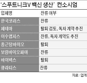 핵심 공정인 백신 원액제조(DS)를 담당하기로 한 제테마는 컨소시엄에서 탈퇴한 뒤 러시아 정부 측과 직접 위탁생산 계약을 맺는 방안을 검토하고 있다. 제테마는 스푸트니크V 백신 생산을 위해 약 80억원을 투자했다. 제테마와 함께 백신 원액 제조를 맡기로 한 이수앱지스는 이미 러시아 정부와 개별 접촉을 시작했다. 이수앱지스 관계자는 “컨소시엄 참여와 독자 생산 등 ‘투 트랙’으로 백신사업을 할 계획”이라고 했다.