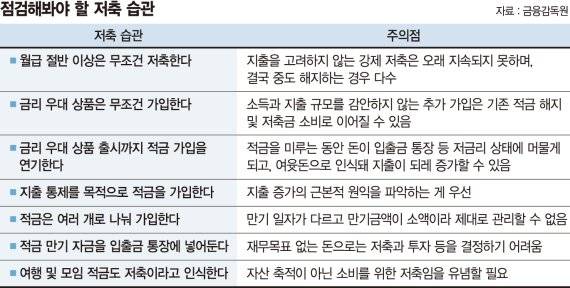 △금리우대 상품이 나오면 무조건 가입 △금리우대 상품 출시 전까지 적금 가입 연기 등도 되짚어봐야 할 저축 습관이다.