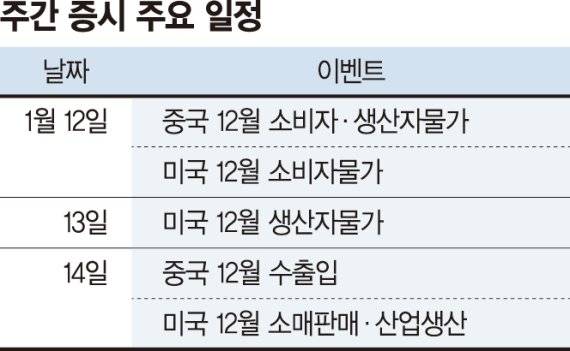 이번 주 예정된 주요 경제지표로는 11일 미국의 12월 NFIB 소기업낙관지수, 12일 한국의 12월 실업률 및 미국의 12월 소비자 물가지수, 중국의 12월 소비자 물가지수 등이 있다. 또 13일에는 미국의 12월 생산자 물가지수 등이 예정됐고 14일에는 한국은행이 올해 첫 금융통화정책위원회를 개최한다.
