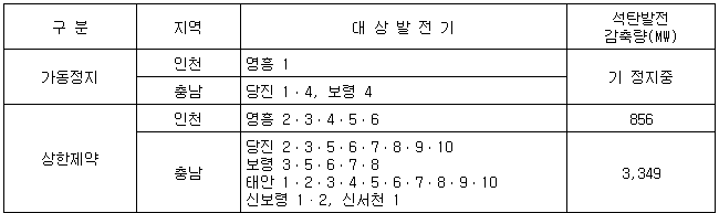 [표] 가동정지 및 상한제약 대상 석탄발전기