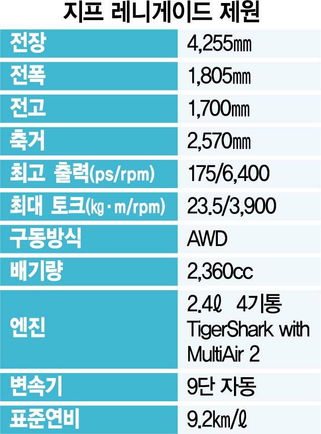 레니게이드는 ‘오프로더’가 사라진 국내 소형·준중형 SUV 시장에 흔치 않은 정통 오프로더다. 기아 스포티지는 애초에 ‘도심형 SUV’라는 장르를 내 걸고 등장했다. 쌍용 코란도 역시 과거 ‘국산 오프로드의 자존심’으로 불렸으나 최근 차명을 ‘뷰티풀’로 내거는 등 이전의 거친 매력을 잃어버렸다. 도요타 라브4, 미니 컨트리맨 등도 오프로더와는 다소 거리가 멀다.