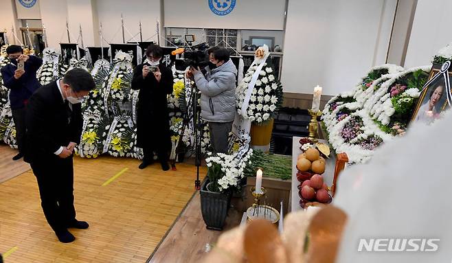 [광주=뉴시스] 변재훈 기자 = 이재명 더불어민주당 대선 후보가 9일 광주 동구 조선대병원장례식장에 차려진 이한열 열사의 모친 고(故) 배은심 여사의 빈소를 조문하고 있다. 2022.01.09. wisdom21@newsis.com