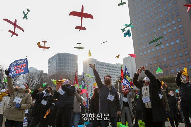 한국여행업협회 등 여행업 종사자들이 9일 서울 종로 보신각 앞에서 코로나19 손실보상과 생존대책을 정부에 촉구하며 모형비행기를 날리고 있다.
