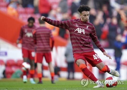 Liverpool's Kaide Gordon kicks the ball during warm up before the English FA Cup third round soccer match between Liverpool and Shrewsbury Town at Anfield stadium in Liverpool, Sunday, Jan. 9, 2022. (AP Photo/Jon Super)