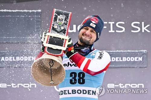 epa09675488 Winner Johannes Strolz of Austria celebrates on the podium for the Men's Slalom race at the FIS Alpine Skiing World Cup in Adelboden, Switzerland, 09 January 2022. EPA/JEAN-CHRISTOPHE BOTT