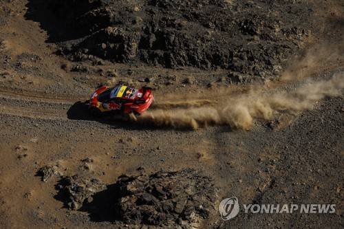 epa09675486 French driver Sebastien Loeb and Belgium copilot Fabian Lurquin of Bahrain Raid Xtreme team in action during the stage 7 of the Rally Dakar 2022 between Riyadh and Al Dawadimi, Saudi Arabia, 09 January 2022. EPA/YOAN VALAT