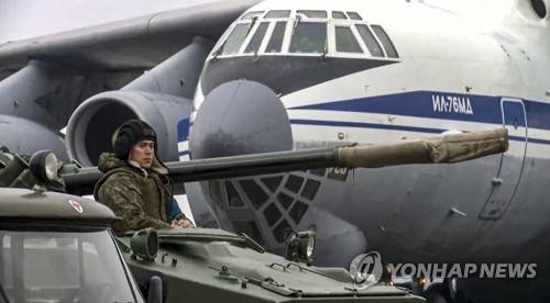In this handout photo released by Russian Defense Ministry Press Service, A Russian peacekeeper looks as vehicles of Russian leave an airport of Almaty, Kazakhstan, Sunday, Jan. 9, 2022. As Kazakhstan struggles to cope with an increasingly violent uprising this week, it has turned for help to a Russian-led security bloc, the Collective Security Treaty Organization. Thousands of Russian troops have now been dispatched to Kazakhstan to help secure strategic facilities. (Russian Defense Ministry Press Service via AP) AP PROVIDES ACCESS TO THIS PUBLICLY DISTRIBUTED HANDOUT PHOTO PROVIDED BY RUSSIAN DEFENSE MINISTRY ; MANDATORY CREDIT.