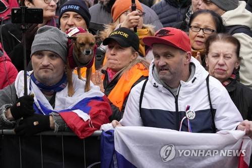 A man carries a dog on his shoulder as people gather to protest against the governments restrictions to curb the spread of COVID-19 in Prague, Czech Republic, Sunday, Jan. 9, 2022. (AP Photo/Petr David Josek)