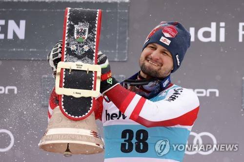 Austria's Johannes Strolz celebrates on the podium of an alpine ski, men's World Cup slalom, in Adelboden, Switzerland, Sunday, Jan.9, 2022. (AP Photo/Giovanni Maria Pizzato)