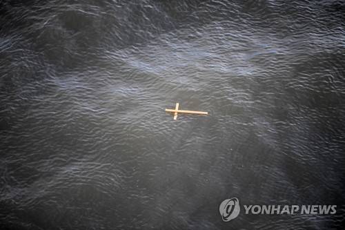epa09675565 A cross floats in the water after members of the clergy and congregation from St Magnus the Martyr Church and Southwark Cathedral threw it as they perform a service blessing the River Thames on London Bridge, in London, Britain, 09 January 2022. The annual service offers prayers for those who work and enjoy leisure time around the Thames. EPA/NEIL HALL