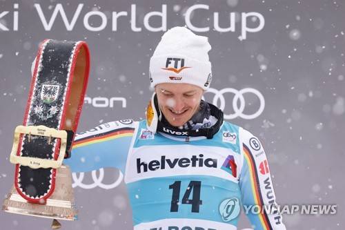 Third placed Germany's Linus Strasser celebrates on the podium of an alpine ski, men's World Cup slalom, in Adelboden, Switzerland, Sunday, Jan.9, 2022. (AP Photo/Giovanni Maria Pizzato)