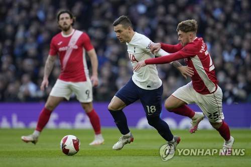 Tottenham's Giovani Lo Celso, left, challenges for the ball with Morecambe's Alfie McCalmont during the English FA Cup third round soccer match between Tottenham Hotspur and Morecambe at the Tottenham Hotspur Stadium in London, Sunday, Jan. 9, 2022.(AP Photo/Matt Dunham)