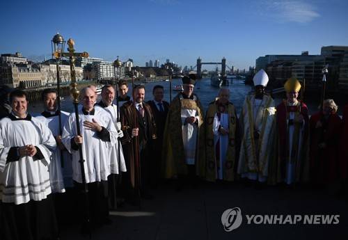 epa09675579 Members of the clergy and congregation from St Magnus the Martyr Church and Southwark Cathedral perform a service blessing the River Thames on London Bridge, in London, Britain, 09 January 2022. The annual service offers prayers for those who work and enjoy leisure time around the Thames. EPA/NEIL HALL