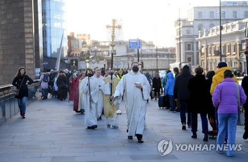 epa09675585 Members of the clergy and congregation from St Magnus the Martyr Church and Southwark Cathedral perform a service blessing the River Thames on London Bridge, in London, Britain, 09 January 2022. The annual service offers prayers for those who work and enjoy leisure time around the Thames. EPA/NEIL HALL