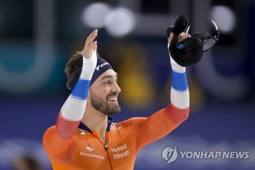 Netherlands' Kjeld Nuis celebrates after winning the men's 1500 meters race of the European Speedskating Championships single distances at the Thialf ice arena in Heerenveen, northern Netherlands, Sunday, Jan. 9, 2022. (AP Photo/Peter Dejong)