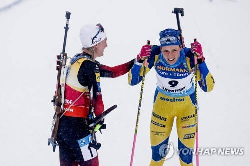 epa09675638 First placed, Marte Olsbu Roeiseland (L) of Norway and second placed Hanna Oeberg of Sweden celebrate at the finish line of the 10 km women?s pursuit competition at the IBU Biathlon World Cup in Oberhof, Germany, 09 January 2022. EPA/RONALD WITTEK