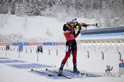 Marte Olsbu Roeiseland from Norway shoots during the women's World Cup Pursuit 10 km race in Oberhof, Germany, Sunday, Jan. 9, 2022. (Hendrik Schmidt/dpa via AP)
