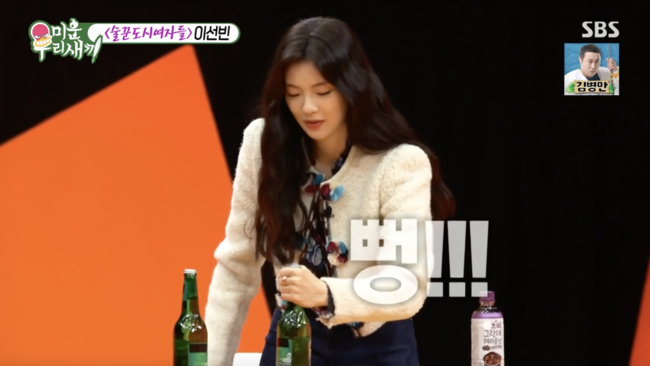 자리에서 벌떡 일어선 이선빈은 "반지를 일단 빼야한다"며 시동을 걸더니 숟가락으로 단번에 병뚜껑을 땄다. 경쾌한 몸짓에 맞춰 뻥 소리가 나자 모두 "큰 소리가 난다"며 놀라워했다. 기세를 몰아 국자로도 도전했으나 아쉽게 실패했고, 이에 옆에 있던 신동엽은 호기심을 발휘, 엉겁결에 성공해 웃음을 자아냈다.