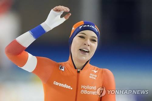 Netherlands Jutta Leerdam celebrates after the women's 1000 meters race of the European Speedskating Championships single distances at the Thialf ice arena in Heerenveen, northern Netherlands, Sunday, Jan. 9, 2022. (AP Photo/Peter Dejong)