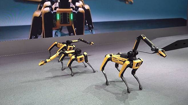 먼저 현대차는 정의선 회장이 국내 그룹 총수로는 유일하게 현장에 참석했는데요, 로봇개 '스팟'을 데리고 나왔죠.