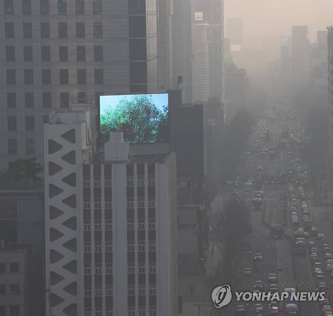 (서울=연합뉴스) 박동주 기자 = 주말 동안 이어진 미세먼지 및 초미세먼지 고농도 상황이 계속된 10일 오전 서울 시내가 뿌옇다. 2022.1.10