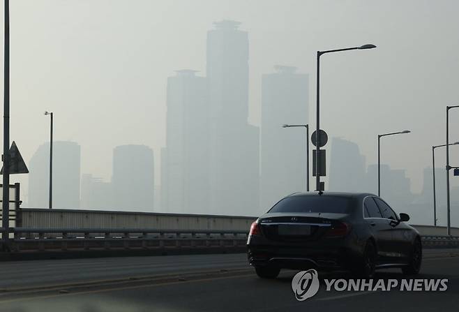 (서울=연합뉴스) 박동주 기자 = 주말 동안 이어진 미세먼지 및 초미세먼지 고농도 상황이 계속된 10일 오전 서울 서강대교에서 바라본 시내가 뿌옇다. 2022.1.10
