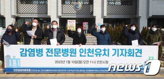 (인천=뉴스1) ,정진욱 기자 = 인천공공의료포럼 관계자들이 10일 오전 인천시청 앞에서 인천 감염병 전문병원 설립을 촉구하는 기자회견을 하고 있다. 2022.1.10/뉴스1