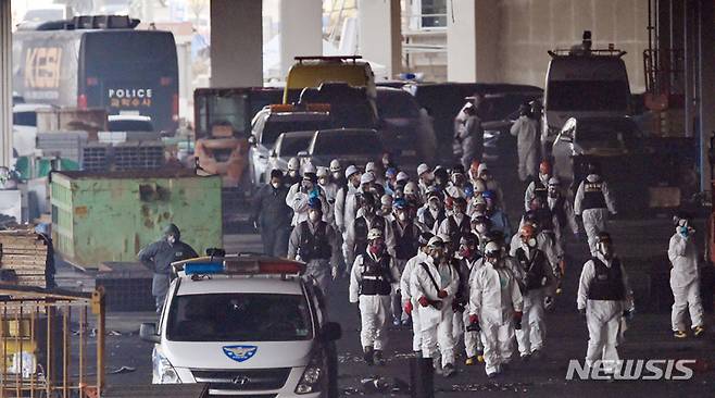 [평택=뉴시스] 김종택기자 = 소방관 3명이 순직한 경기도 평택 냉동창고 신축 공사장 화재현장에서 10일 오전 경찰과 소방, 국과수 등 관계자들이 합동감식을 위해 현장으로 이동하고 있다. 2022.01.10.