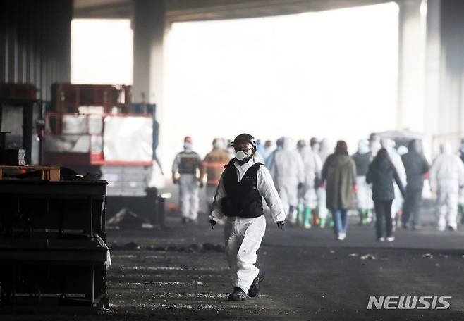 [평택=뉴시스] 김종택기자 = 소방관 3명이 순직한 경기도 평택 냉동창고 신축 공사장 화재현장에서 10일 오전 경찰과 소방, 국과수 등 관계자들이 합동감식을 위해 현장으로 이동하고 있다. 2022.01.10.