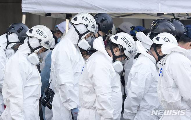 [평택=뉴시스] 김종택기자 = 소방관 3명이 순직한 경기도 평택 냉동창고 신축 공사장 화재현장에서 10일 오전 경찰과 소방, 국과수 등 관계자들이 합동감식 전 묵념을 하고 있다. 2022.01.10.