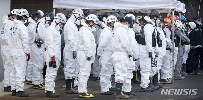 [평택=뉴시스] 김종택기자 = 소방관 3명이 순직한 경기도 평택 냉동창고 신축 공사장 화재현장에서 10일 오전 경찰과 소방, 국과수 등 관계자들이 합동감식 전 묵념을 하고 있다. 2022.01.10.