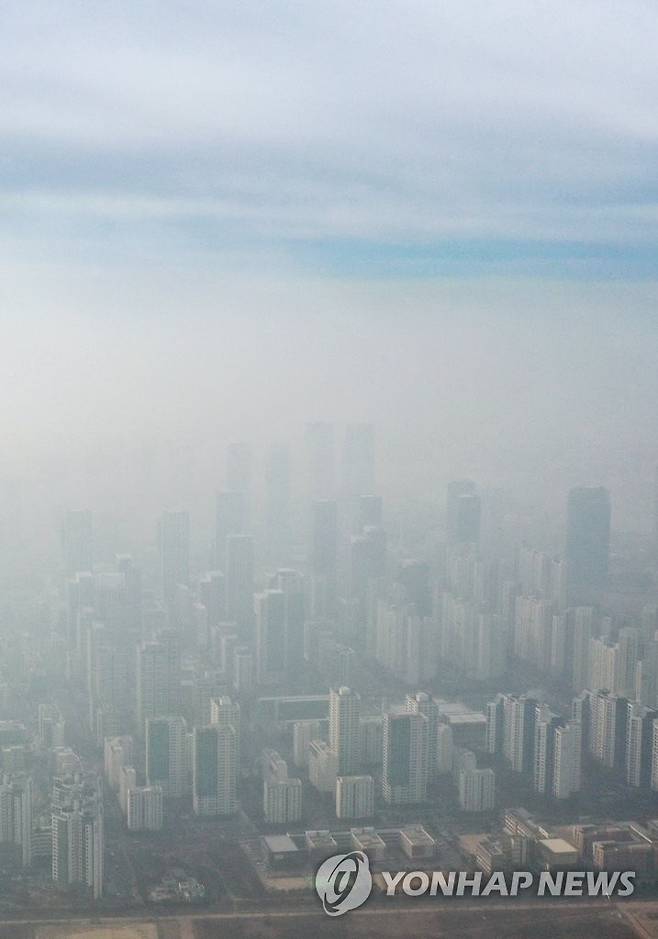 (인천=연합뉴스) 윤태현 기자 = 인천지역에 미세먼지 비상저감조치가 시행된 10일 오전 인천시 연수구 동춘터널 인근에서 바라본 송도국제도시가 미세먼지에 가려 희미하게 보인다. 2022.1.10