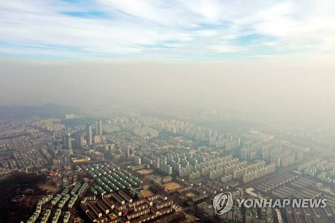 (인천=연합뉴스) 윤태현 기자 = 인천지역에 미세먼지 비상저감조치가 시행된 10일 오전 인천시 연수구 동춘터널 인근에서 바라본 연수구 일대가 미세먼지에 가려 희미하게 보인다. 2022.1.10