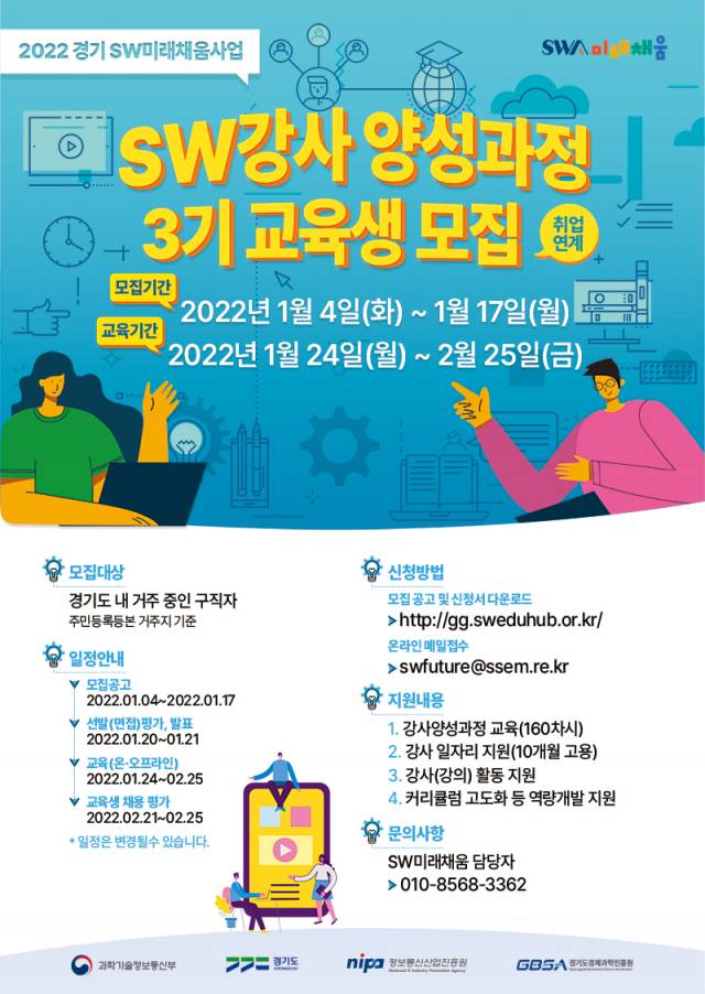 경기도경제과학진흥원(이하 경과원)은 미래 소프트웨어(SW)인재 양성기반 마련을 위해 '소프트웨어 강사 양성과정'에 참여할 교육생 80명을 오는 17일까지 모집한다고 10일 밝혔다.