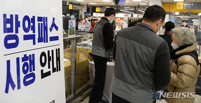 [전주=뉴시스] 김얼 기자 = 대형마트와 대규모 점포 등의 출입 방역패스(접종증명·음성확인제) 의무화 시행 첫 날인 10일 전북 전주시의 한 대형마트에서 한 시민이 QR코드 출입 인증에 어려움을 겪자 직원이 안내를 하고 있다. 2022.01.10. pmkeul@nwsis.com