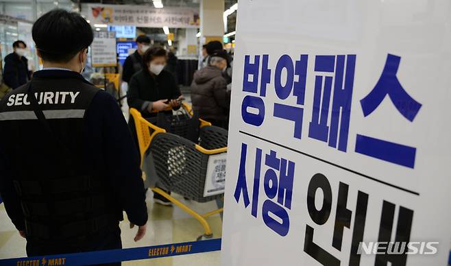 '대규모 점포 방역패스 첫 날 안내문 붙은 대형마트'