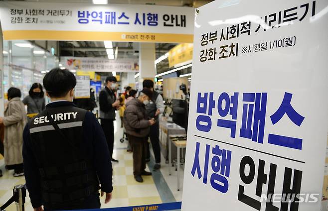 [전주=뉴시스] 김얼 기자 = 대형마트와 대규모 점포 등의 출입 방역패스(접종증명·음성확인제) 의무화 시행 첫 날인 10일 전북 전주시의 한 대형마트에서 시민들이 QR코드 출입 인증을 하고 있다. 2022.01.10. pmkeul@nwsis.com