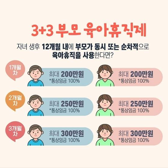 ’22년부터 자녀 생후 12개월 내 부모가 동시에 또는 순차적으로 육아휴직 사용 시, 첫 3개월에 대해 부모 각각의 육아휴직 급여를 상향하여 지급하는 ‘3+3 부모육아휴직제’가 시행됩니다.