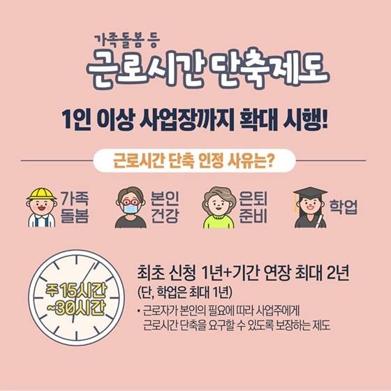 ‘가족돌봄 등 근로시간 단축 제도’가 30인 미만 사업장까지 전 사업장으로 확대 시행됩니다.